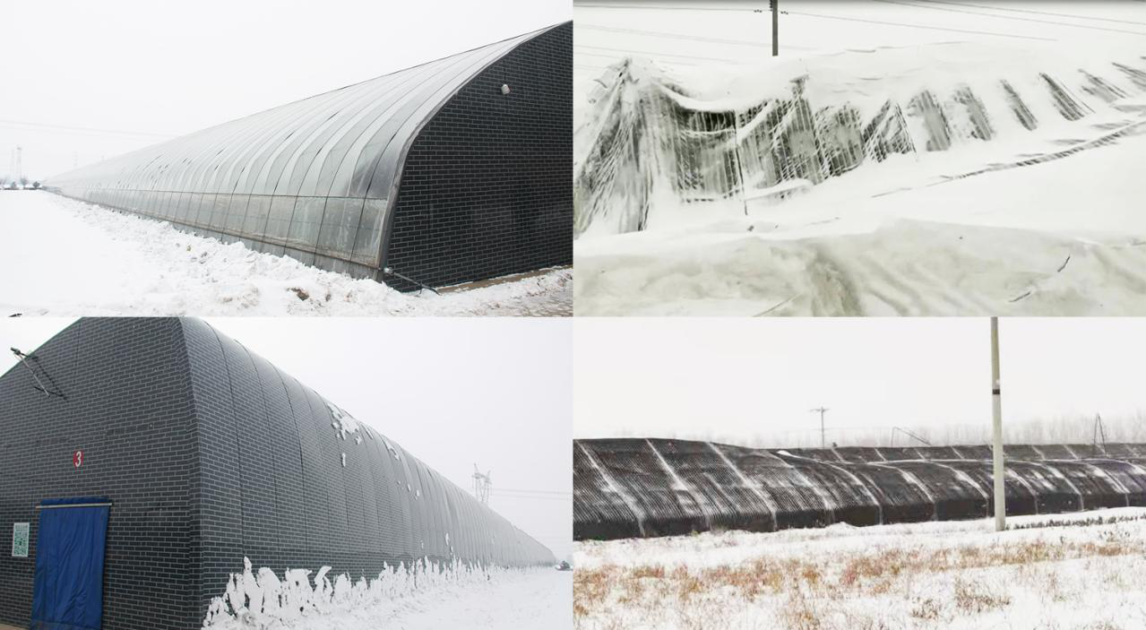 在寒冷的冬季里,若遇到突如襲來(lái)的降雪或狂風(fēng),北方高寒地區(qū)設(shè)施農(nóng)業(yè)生產(chǎn)將會(huì)受到嚴(yán)重影響,北方多數(shù)溫室因?yàn)榉e雪和狂風(fēng)導(dǎo)致坍塌,而這時(shí)水蓄熱內(nèi)保溫裝配式日光溫室表現(xiàn)出強(qiáng)勁的使用性能。圖一為水蓄熱內(nèi)保溫裝配式日光溫室,內(nèi)保溫被正常卷起,落在溫室棚膜上的積雪自動(dòng)滑落,不影響設(shè)施使用及作物生長(zhǎng)。圖二為普通外保溫溫室,外保溫被積雪,不能卷起,設(shè)施承重增加,多半溫室被積雪壓塌,嚴(yán)重壓傷農(nóng)作物,同時(shí)溫室內(nèi)無(wú)光照,無(wú)法積溫及進(jìn)行作物生長(zhǎng)。