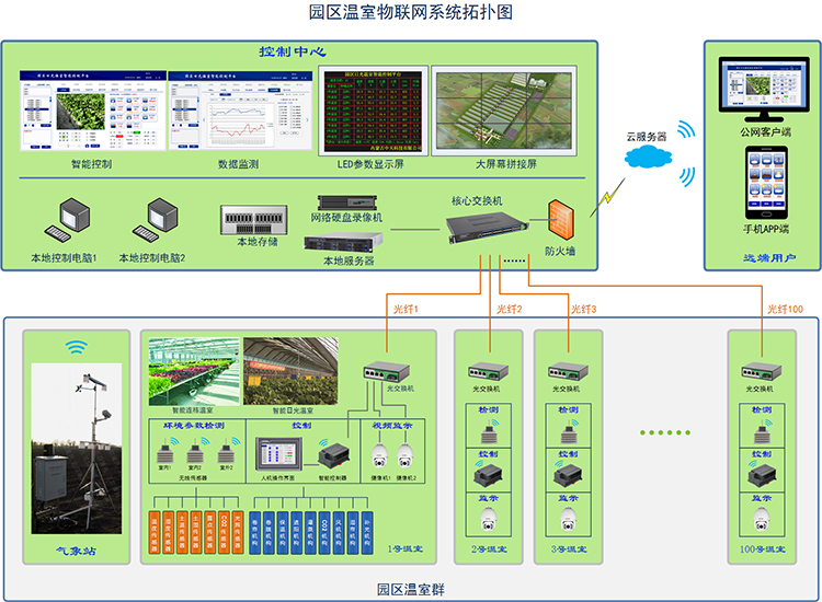 設(shè)施農(nóng)業(yè)智能控制系統(tǒng):通過農(nóng)業(yè)物聯(lián)網(wǎng)系統(tǒng),可以設(shè)定溫室內(nèi)各種設(shè)備運(yùn)行環(huán)境條件,當(dāng)環(huán)境信息未達(dá)到預(yù)先制定的條件時(shí),自動(dòng)啟動(dòng)溫室內(nèi)的相關(guān)設(shè)備,比如:風(fēng)機(jī)自動(dòng)調(diào)節(jié)通風(fēng)降溫、內(nèi)外遮陽自動(dòng)調(diào)節(jié)光照強(qiáng)度、自動(dòng)噴滴灌、自動(dòng)加濕除濕、自動(dòng)施肥,實(shí)現(xiàn)智能化管理,節(jié)水,省電,省人工,更省心。